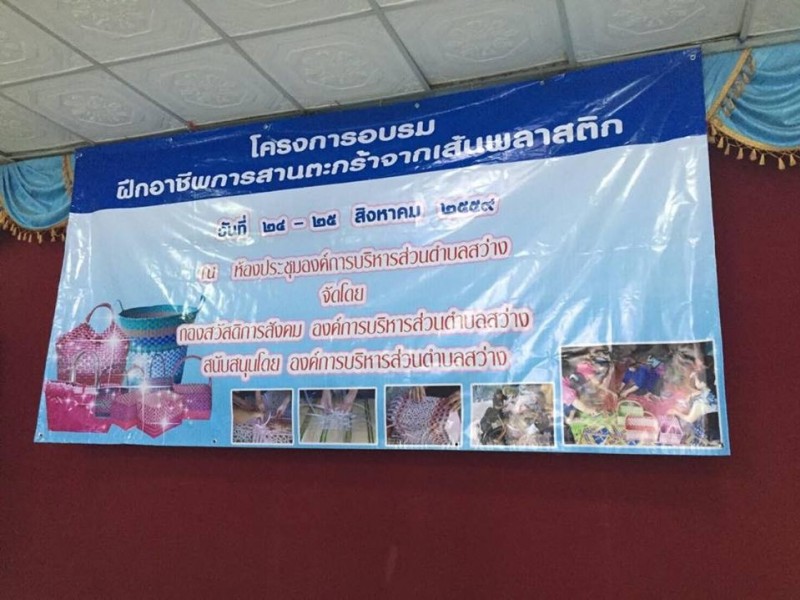 29 สิงหาคม 2559 12:12 น.โครงการอบรมฝึกอาชีพการสานตะกร้าจากเส้นพลาสติก วันที่ 24 - 25 สิงหาคม 2559 ณ.ห้องประชุมองค์การบริหารส่วนตำบลสว่าง จัดโดย กองสวัสดิการสังคม องค์การบริหารส่วนตำบลสว่าง สนับสนุนโดย องค์การบริหารส่วนตำบลสว่าง