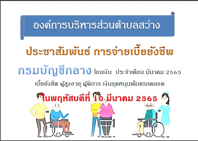 ประชาสัมพันธ์ กำหนดการแจกเบี้ยยังชีพ ประจำเดือนกุมภาพันธ์ 2565 ในวันพฤหัสบดีที่ 10 มีนาคม 2565