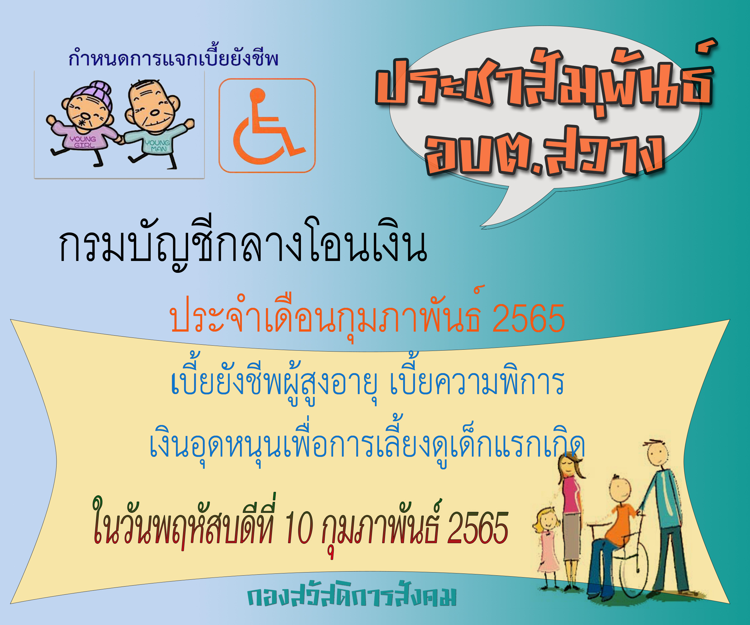 ประชาสัมพันธ์ กำหนดการแจกเบี้ยยังชีพ ประจำเดือนกุมภาพันธ์ 2565 ในวันพฤหัสบดีที่ 10 กุมภาพันธ์ 2565